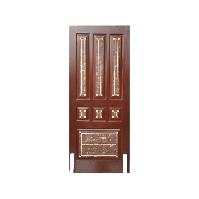 A solid wooden door featuring rich brown finishing with decorative mosaic panels made from natural