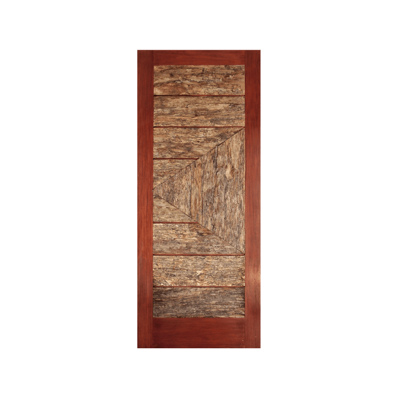A solid wooden door featuring rustic bark-textured panels framed in warm reddish wood. The bold
