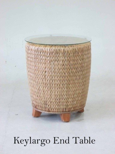 A round woven end table with a natural fiber base, wooden feet, and a smooth glass top. The Keylargo End Table adds a warm, coastal touch while offering a practical surface beside a sofa or lounge chair.