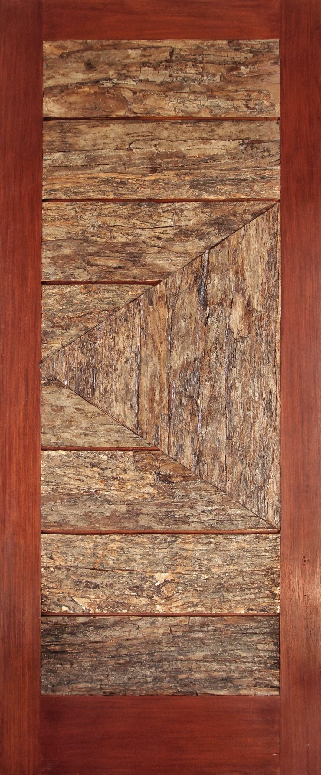 A solid wooden door featuring rustic bark-textured panels framed in warm reddish wood. The bold diagonal inlay creates a striking geometric pattern, giving any entrance a natural yet contemporary statement look.
